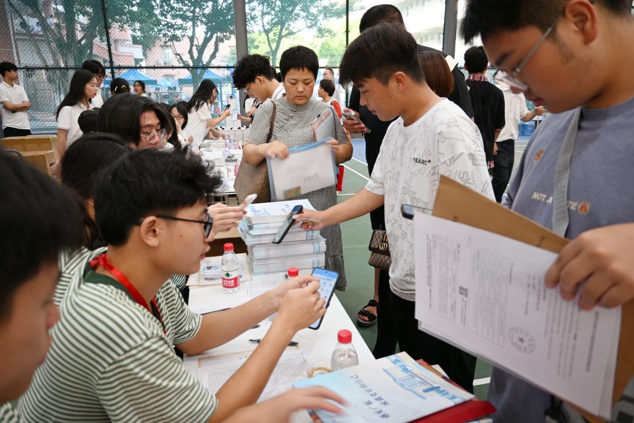 校门口,身着海魂衫的工作人员早已就位,他们面带微笑,耐心为每一位新生及家长指引报到流程,从路线规划到材料核对,细致解答各类疑问,引导新生完成易班线上APP扫码报到,用专业与热情驱散新生初来乍到的陌生感。