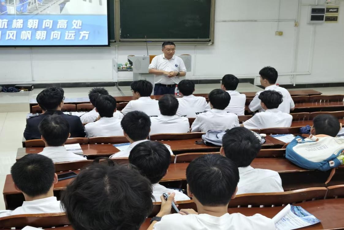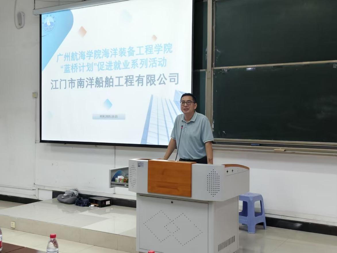 2025年10月15日下午,广州航海学院海洋装备工程学院第三次“蓝桥计划”促就业系列活动在教学楼109教室成功举办。本次活动邀请校企合作单位——江门市南洋船舶工程有限公司(以下简称“江门南洋”)来校进行专场宣讲招聘。江门南洋副总经理朱继雷和学院党委副书记朱钧出席活动。