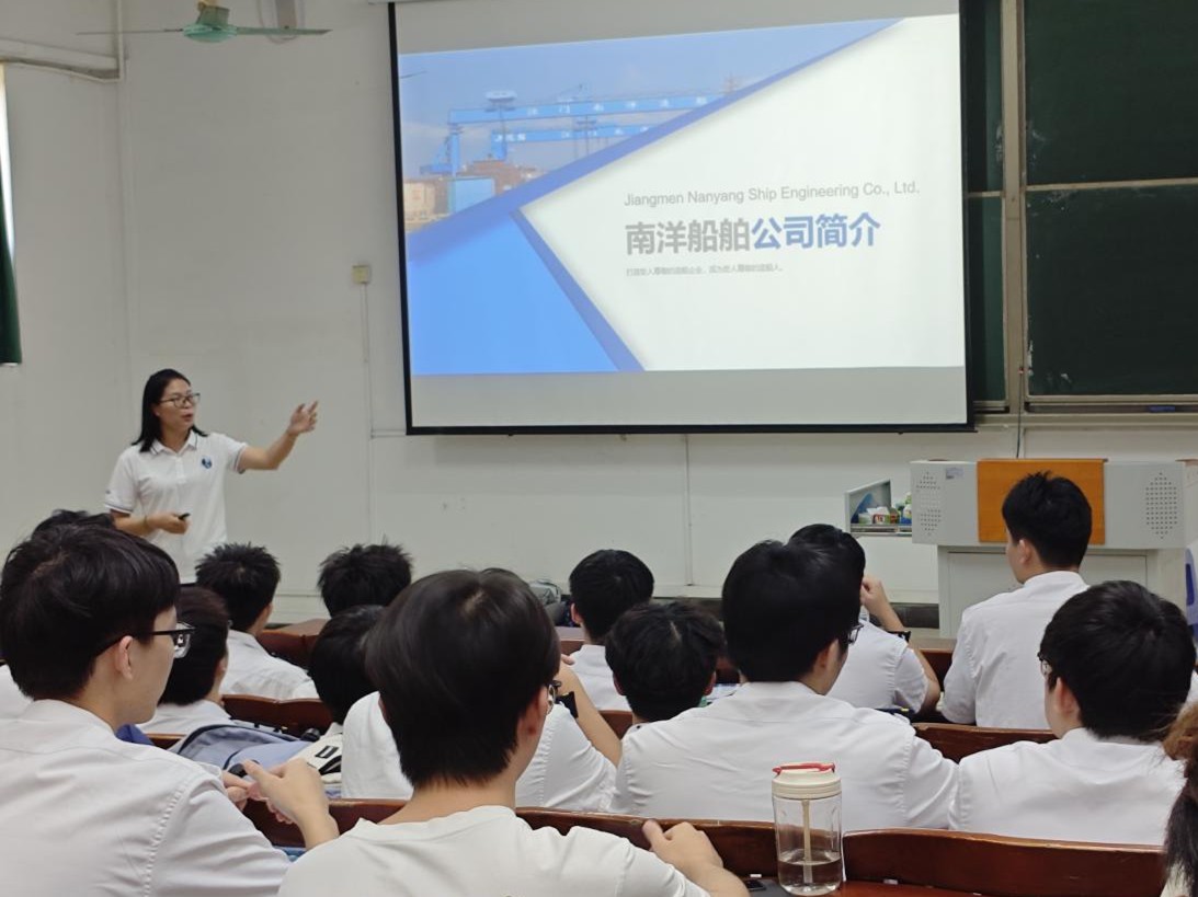 江门南洋人力资源部刘韶贤详细地介绍了公司。她围绕公司发展历程、主营业务、技术优势及在细分市场的地位进行了阐述,全面展示了江门南洋的企业实力与发展前景,同时,她重点介绍了与学院船舶与海洋工程、能源与动力工程等专业匹配的岗位需求及人才培养模式,为同学们提供了清晰的职业规划参考。